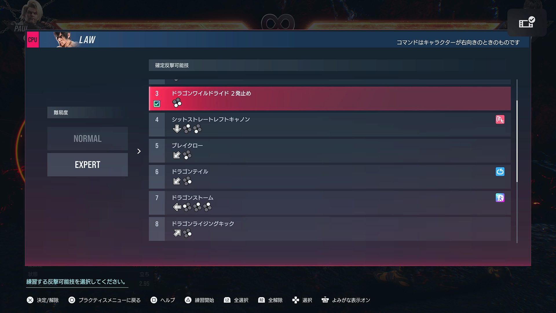 「PRACTICE」では、アドバイスされたもの以外の反撃技も、CPUに技を出させながら練習することができる。ちょうどいいリプレイがなくても、苦手な技を選択して対策できるのはとても便利だ。