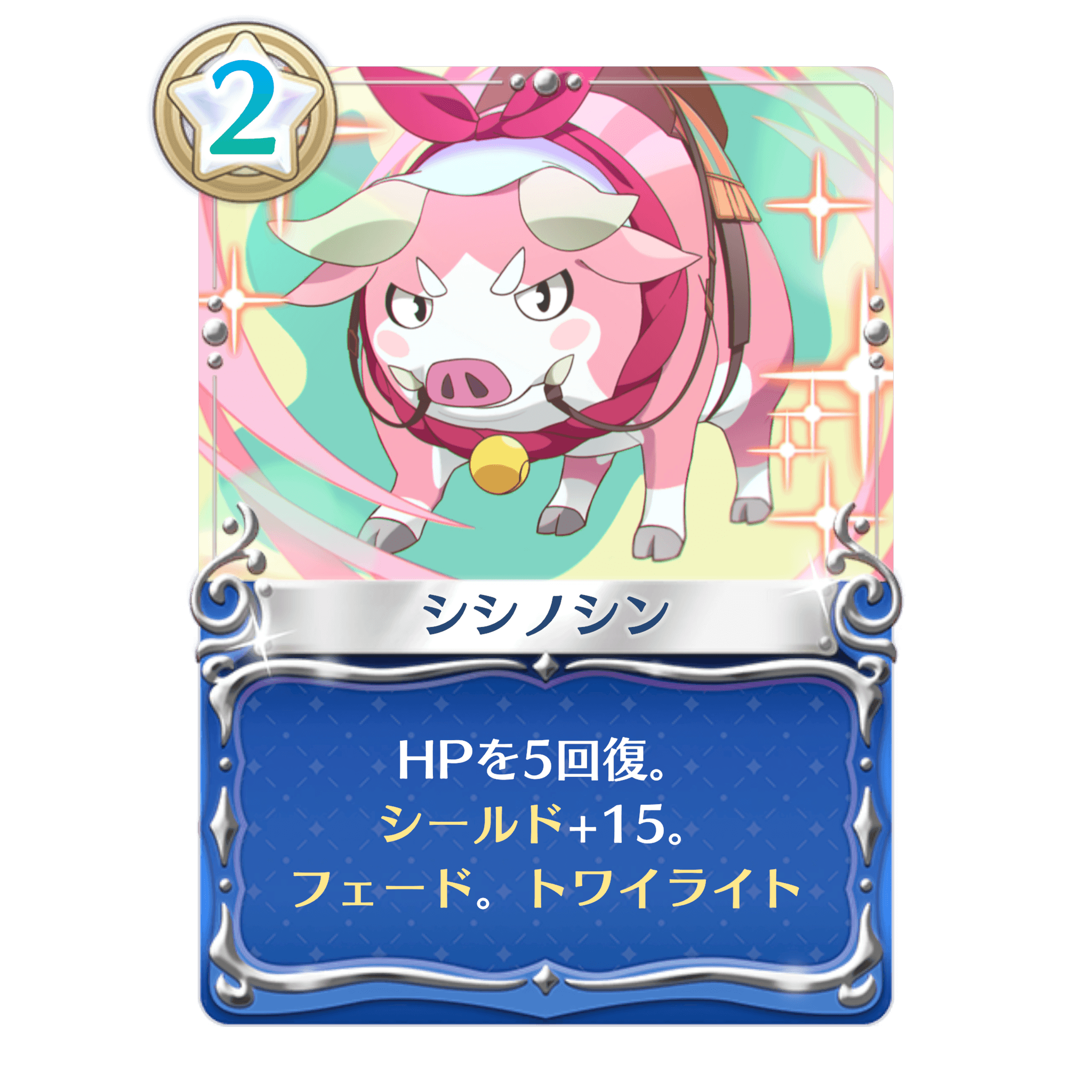 “シシノシンバッジ”は、5ターンごとに“シシノシン”のカードを手札に加えてくれる効果のチャームになっています。“シシノシン”はHP回復ができる希少なカードです!