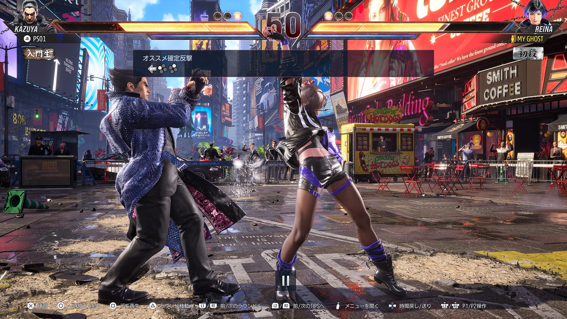 自分の対戦リプレイを再生し、改善ポイントのアドバイスを確認できるモードが「MY REPLAY & TIPS」だ。オンライン対戦はもちろん、「ARCADE QUEST」や「SUPER GHOST BATTLE」など、オフラインモードの対戦もリプレイの対象となる。リプレイを再生していると、バトル中に繰り出したコンボより大きなダメージが出るオススメのコンボや、確定反撃、投げ抜け、しゃがんで回避できる上段攻撃などのアドバイス(TIPS)がリアルタイムに表示され、そのまま反復練習を行なうことができる。