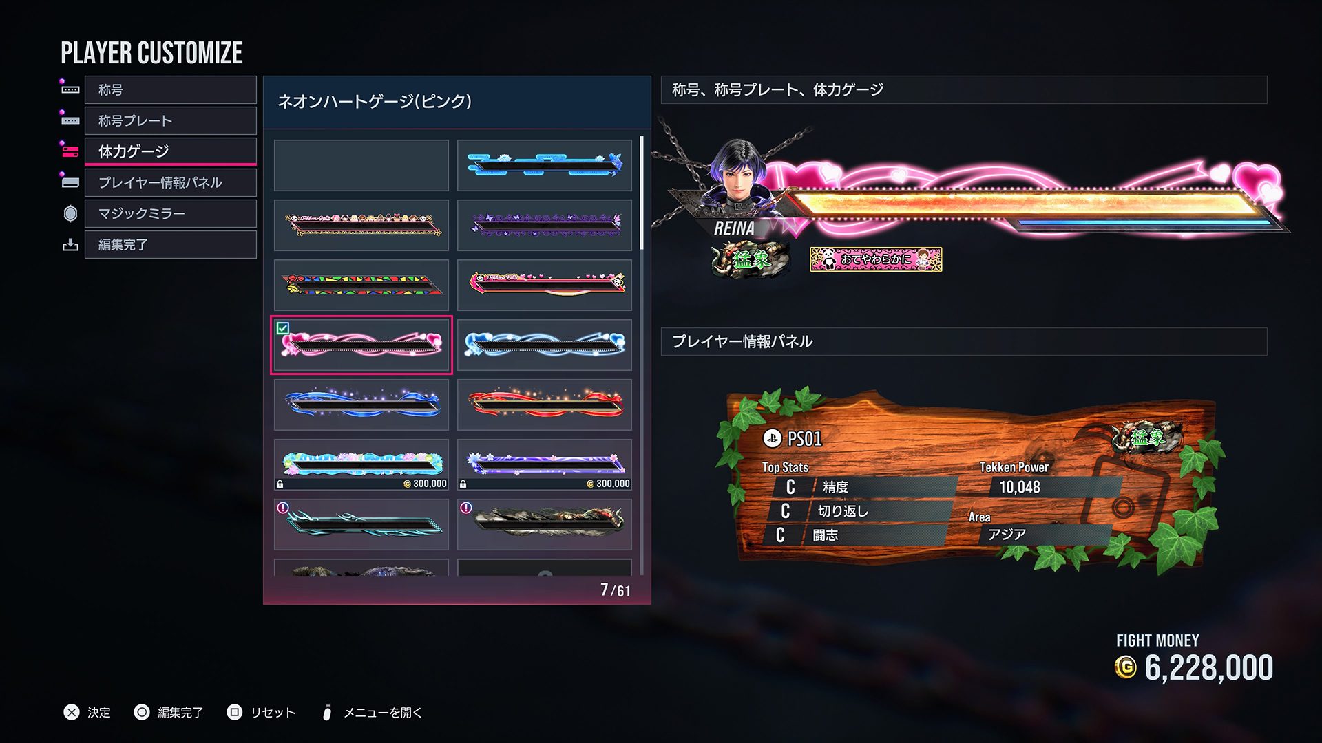 バトルで操作するプレイアブルキャラクターや、「ARCADE QUEST」や「TEKKEN FIGHT LOUNGE」で使用するアバター、対戦時に表示される称号や体力ゲージ、プロフィールなどをカスタマイズできる。