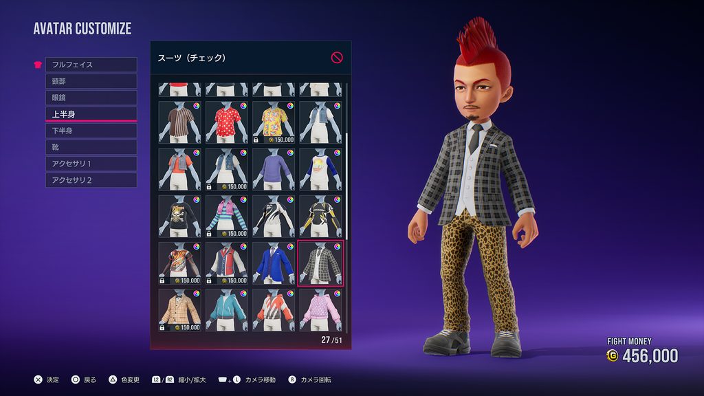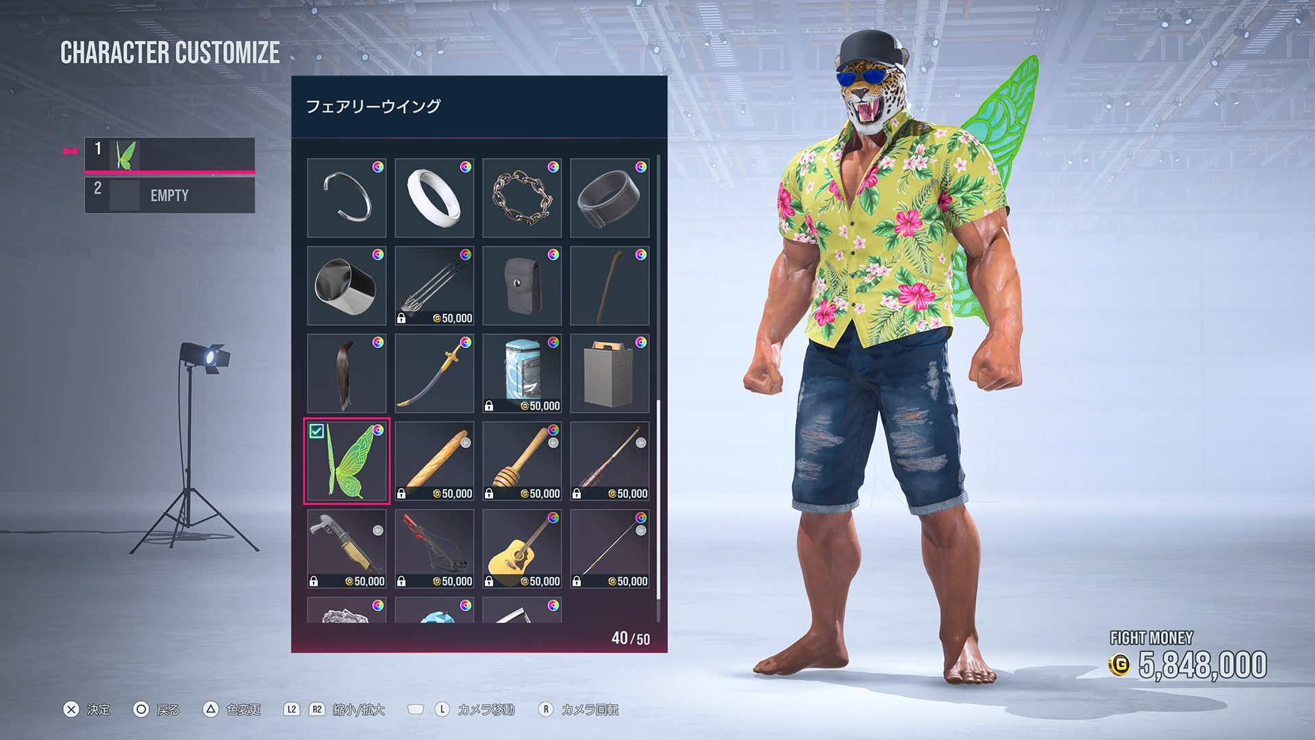 プレイアブルキャラクターのカスタマイズは前作より自由度がアップし、「全身」「頭部」「眼鏡」「上半身」「下半身」「2種のアクセサリ」などに加え「靴」も対象に。各パーツはカラーの変更が可能で、アクセサリは大きさや設定位置も変更できる。カスタマイズに必要なアイテムは、バトルで得られるファイトマネーや各モードのやり込みなどで入手可能だ。