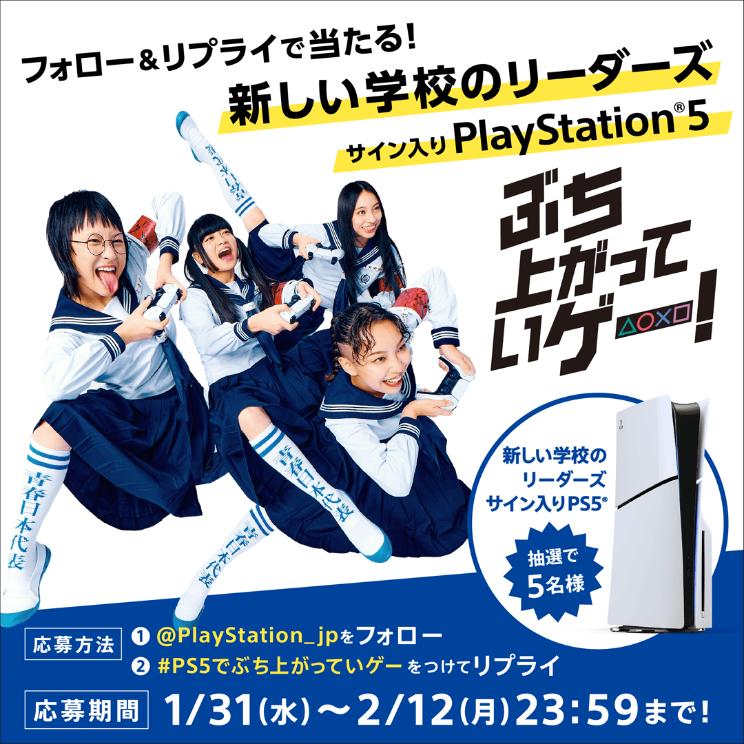 本CMの公開を記念して、本日よりプレイステーション公式X(旧Twitter)でのフォロー&リプライキャンペーンを実施します。2月12日(月)までに下記の手順で応募いただいた方の中から、抽選で「新しい学校のリーダーズ直筆サイン入りPS5」を5名様にプレゼントします(※2)。この機会に、ぜひご参加ください。