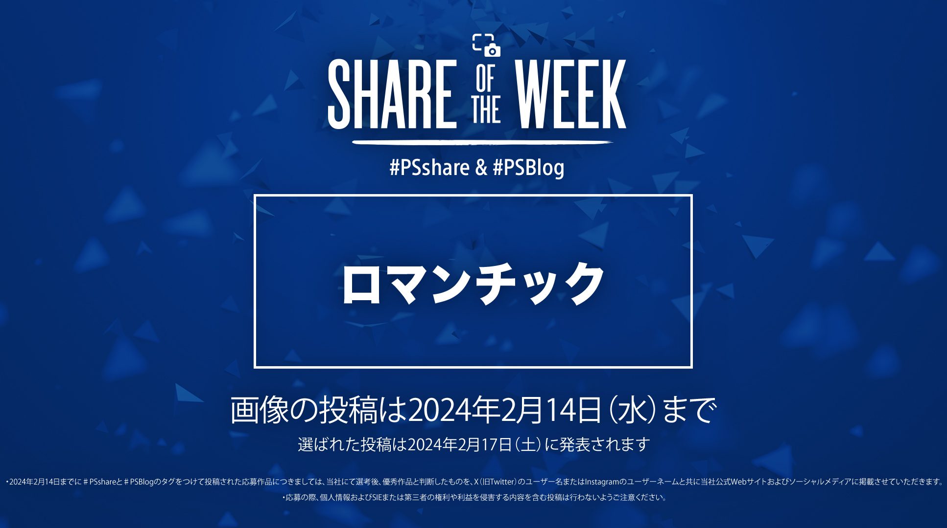次週のテーマは“ロマンチック” ! もうすぐバレンタイン! お気に入りのゲームでロマンチックな瞬間や、キャラクターをキャプチャして#PSshareと#PSBlog、ふたつのハッシュタグとともに、2月14日(水)までに投稿してください。あなたの投稿が各国のPS公式メディアから世界中に発信されるチャンスです!