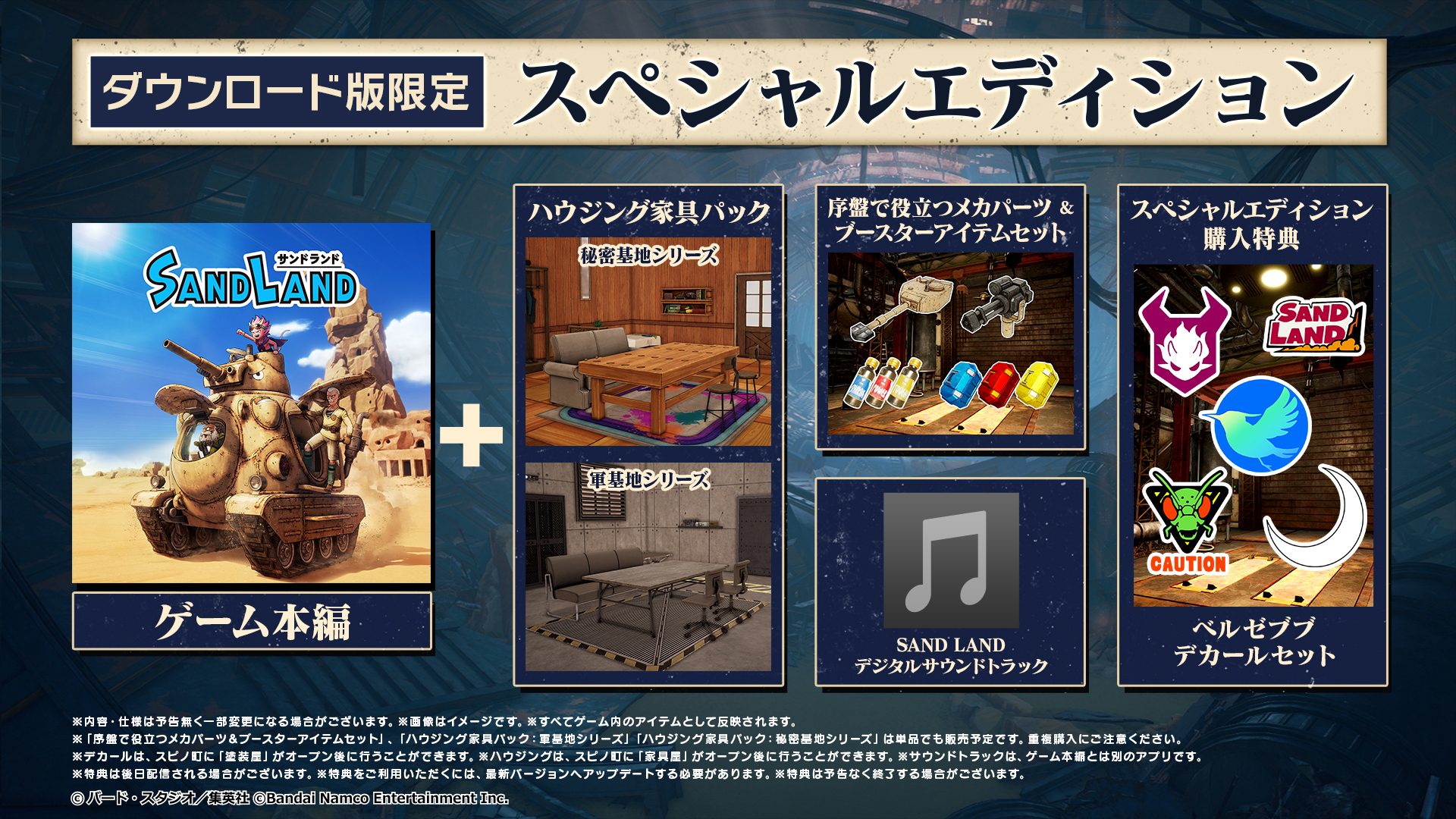 ダウンロード版は通常版だけでなく『スペシャルエディション』も販売中だ。ゲーム本編に加えて、ハウジング用の家具パック(秘密基地シリーズ/軍基地シリーズ)や、序盤で役立つメカパーツ&ブースターアイテムセット、デジタルサウンドトラックがセットになっており、さらに『スペシャルエディション』購入特典としてベルゼブブのデカールセットも付属する。