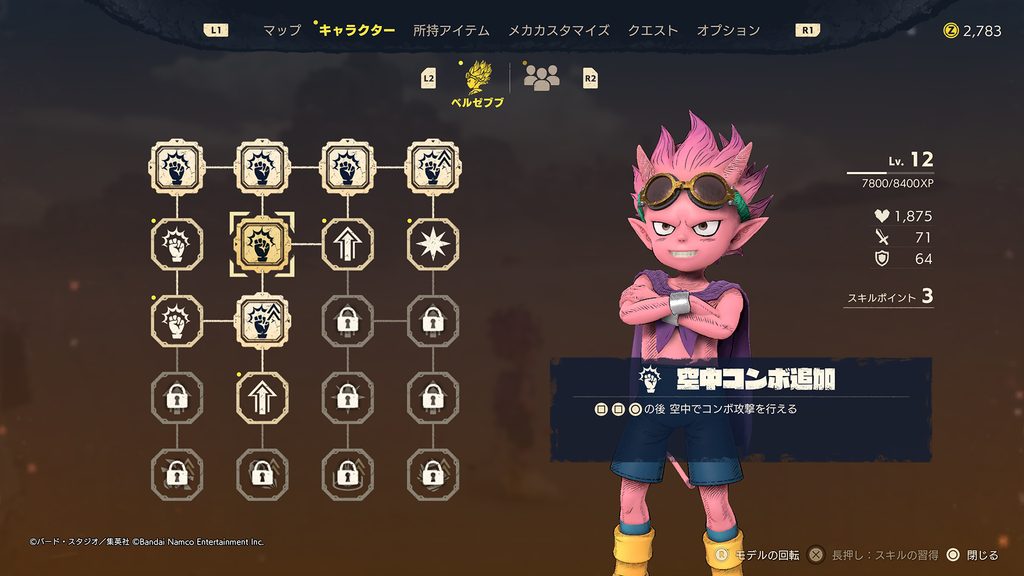 ベルゼブブはレベルが上がると体力、攻撃力、防御力といったステータスが上昇していくのに加えて、スキルポイントを入手できる。このスキルポイントを消費して、さまざまなスキルを取得することが可能だ。