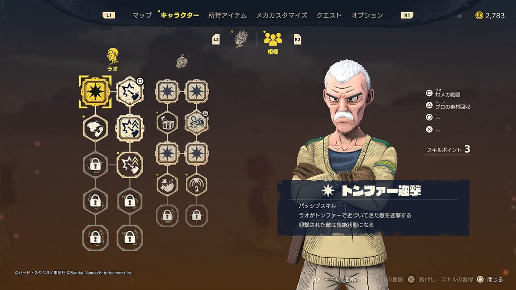 取得するスキルはスキルツリーから任意に選択できるため、どのスキルから取得するか頭を悩ませることになるのだが、それもまた楽しい。さらに、通常のスキルポイントとは異なるポイントを消費して、ラオやシーフに手助けしてもらう「相棒スキル」を取得することも可能だ。相棒スキルは、任意のタイミングで使用する「アクティブスキル」と取得するだけで効果を発揮する「パッシブスキル」が存在する。