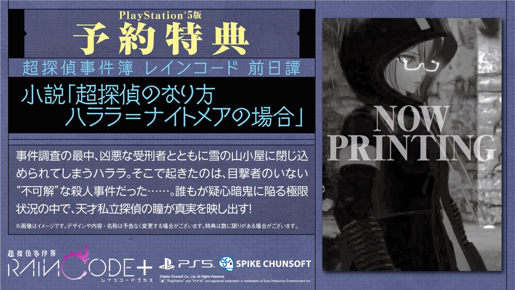 PS5パッケージ版『超探偵事件簿 レインコード プラス』を予約購入された皆さんに、ゲーム本編の前日譚を描いた全67ページのオリジナル書き下ろし小説「超探偵のなり方 ハララ=ナイトメアの場合」をお付けします。本書は、”過去視”の探偵特殊能力を持つ”ハララ=ナイトメア”の過去を描いた物語で、本ゲームのシナリオを手掛ける小高和剛氏監修の書き下ろし小説です。ゲームのプレイ前に読んでも問題ない作品となっています。