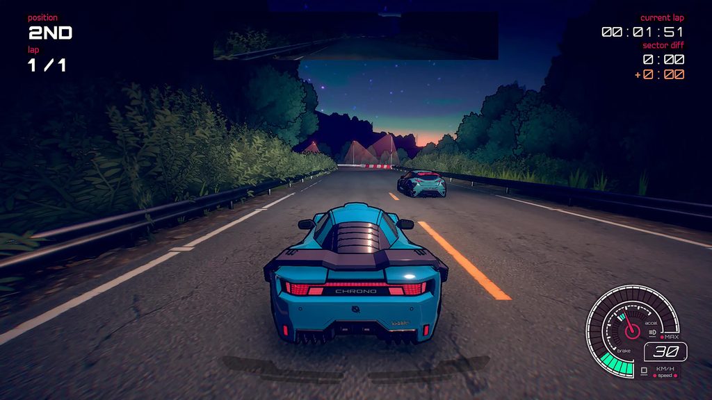 レースを繰り広げるのは、90年代のレトロフューチャーな空間。ネオンピンクに染まる夕暮れや黄昏の空の下、曲がりくねったさまざまな道を走行することになる。相棒となる車の種類は多種多様。スポーツハッチバック、クーペ、スーパーカーなどが、条件をクリアするごとにアンロックされていく。それぞれが異なる特性を持ち、個性も強烈。そのすべてを手なずけ、乗りこなそう。