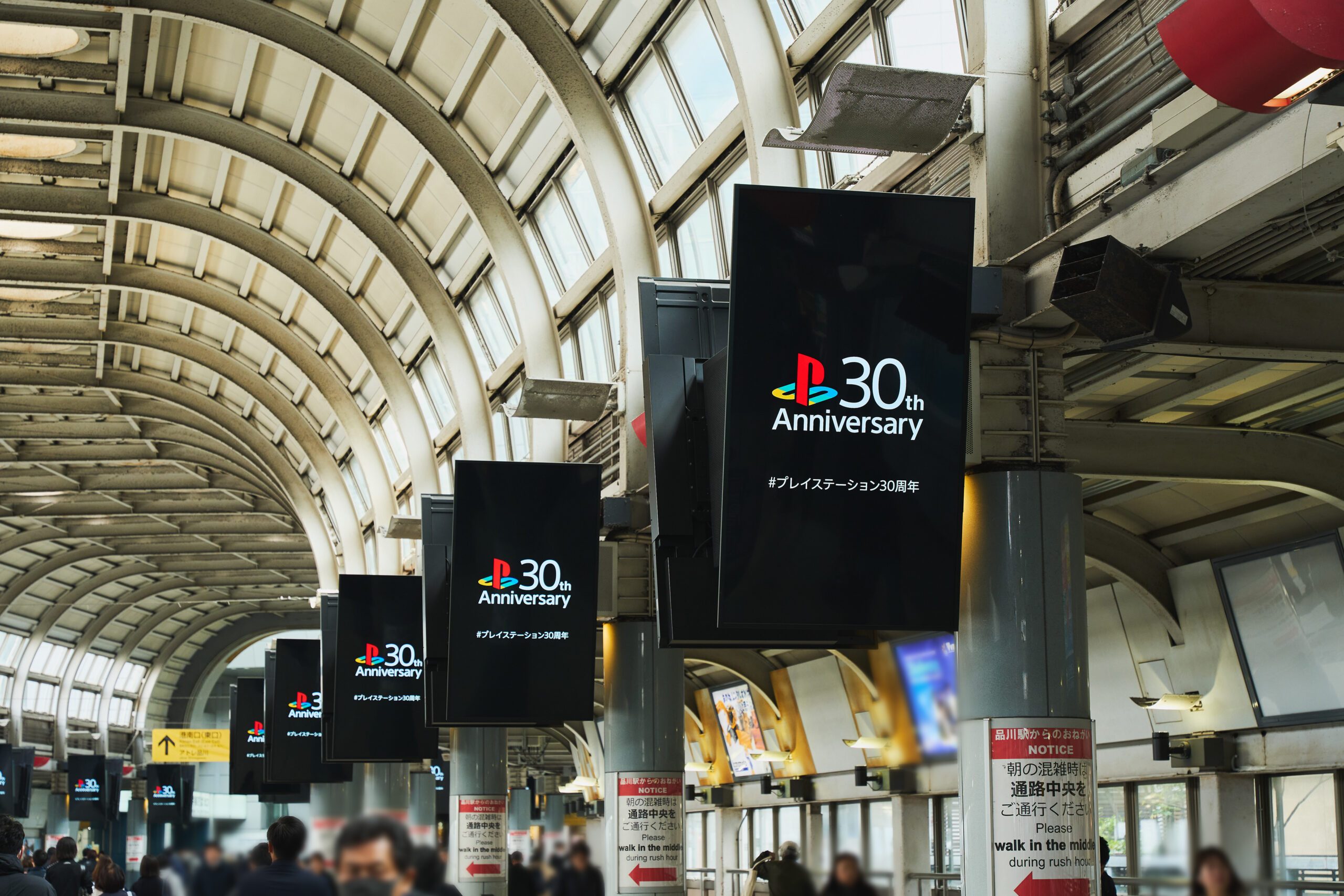 12月2日(月)より東京・JR品川駅の自由通路で、全44面のスクリーンで掲出されるJ・ADビジョンにて、プレイステーション30周年を記念した3種の特別映像を掲出します。歴代プロダクトのビジュアルがずらっと並んだモニターに映し出される様は、圧巻です。お立ち寄りの際はぜひ30年のプレイステーションの旅路にそっと想いをはせながらご通行ください。
