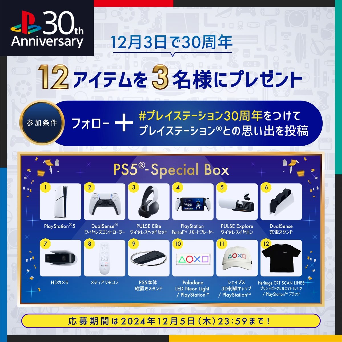 初代プレイステーションの発売日である12月3日にちなんで、PlayStation®5を含む豪華「12」アイテムがセットになった「PS5-Special Box」を「3」名様に抽選でプレゼントします。