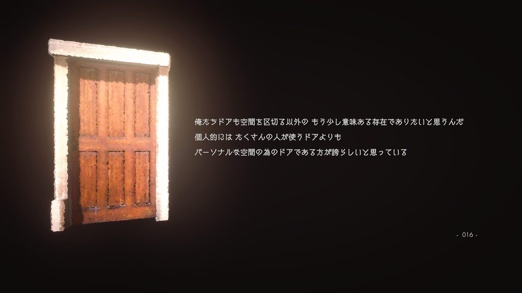 セリフでは、何が正しいかや結論を押し付けることはありません。プレイヤーが自分の環境に照らし合わせてみたり、以前の記憶にアクセスしたりして、自己対話できる時間を作りたかったのです。そうやってセリフを平面的な一視点だけではなく、立体的で多層的に、自分の記憶と照らし合わせながらさまざまな角度から味わえるようにしたかったのです。