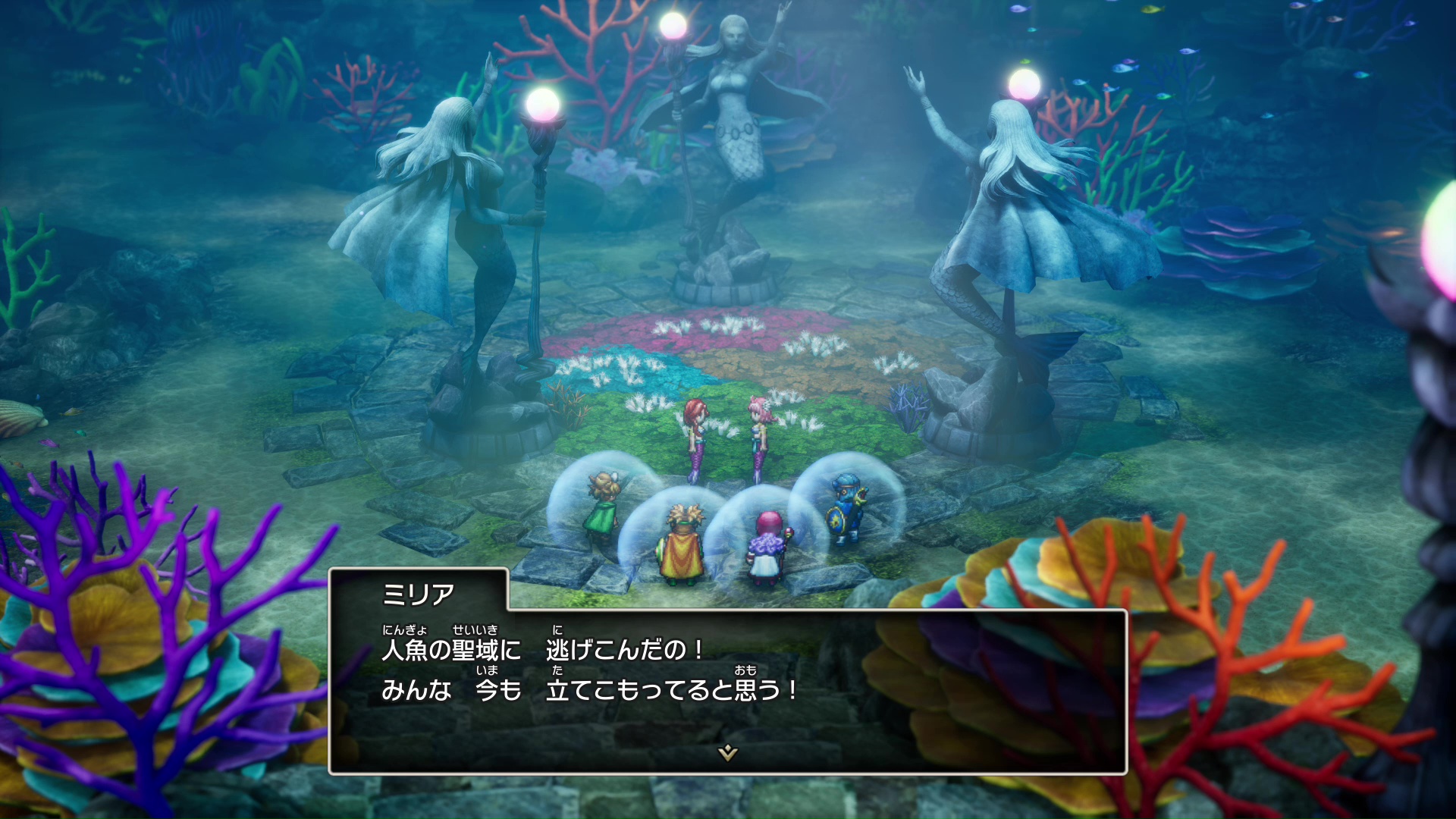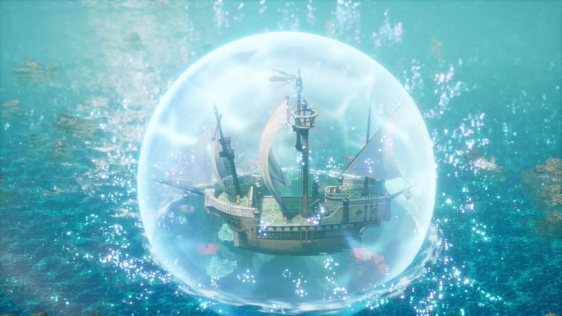 『ドラゴンクエストII』では、新たな冒険の舞台として海底が追加されている。海底で揺れる陽の光、カラフルな珊瑚の美しくも繊細な描写は、HD-2Dグラフィックならでは。海底で人魚に出会ったあとは船も使えるようになり、大海原で船旅を楽しめる。「マーメイドハープ」を所持していると、船が泡に包まれて潜水できるため、海底と海上の行き来も自由自在。L3ボタンとR3ボタンで簡単に浮上・潜水でき、陸地と同じシンプルな操作で海中を移動できる。さらに、潜水時にはミニマップが海底レーダーとなり、周囲の状況を確認できる。海底でアイテムを見つけたり、船体を浮上させて島に上陸したりと、あちこち探索したくなる。ただし、船に乗っていても当然モンスターとエンカウントすればバトルが発生するので要注意。海上と海底では遭遇するモンスターの種類も変わるうえ、「ヒャダイン」による全体攻撃や「マヌーサ」で状態異常攻撃を仕掛けてくるマーマンダインのような厄介な敵も出現。このほかにも、原作にはいなかったモンスターが複数登場するので、その顔ぶれにも注目しよう。