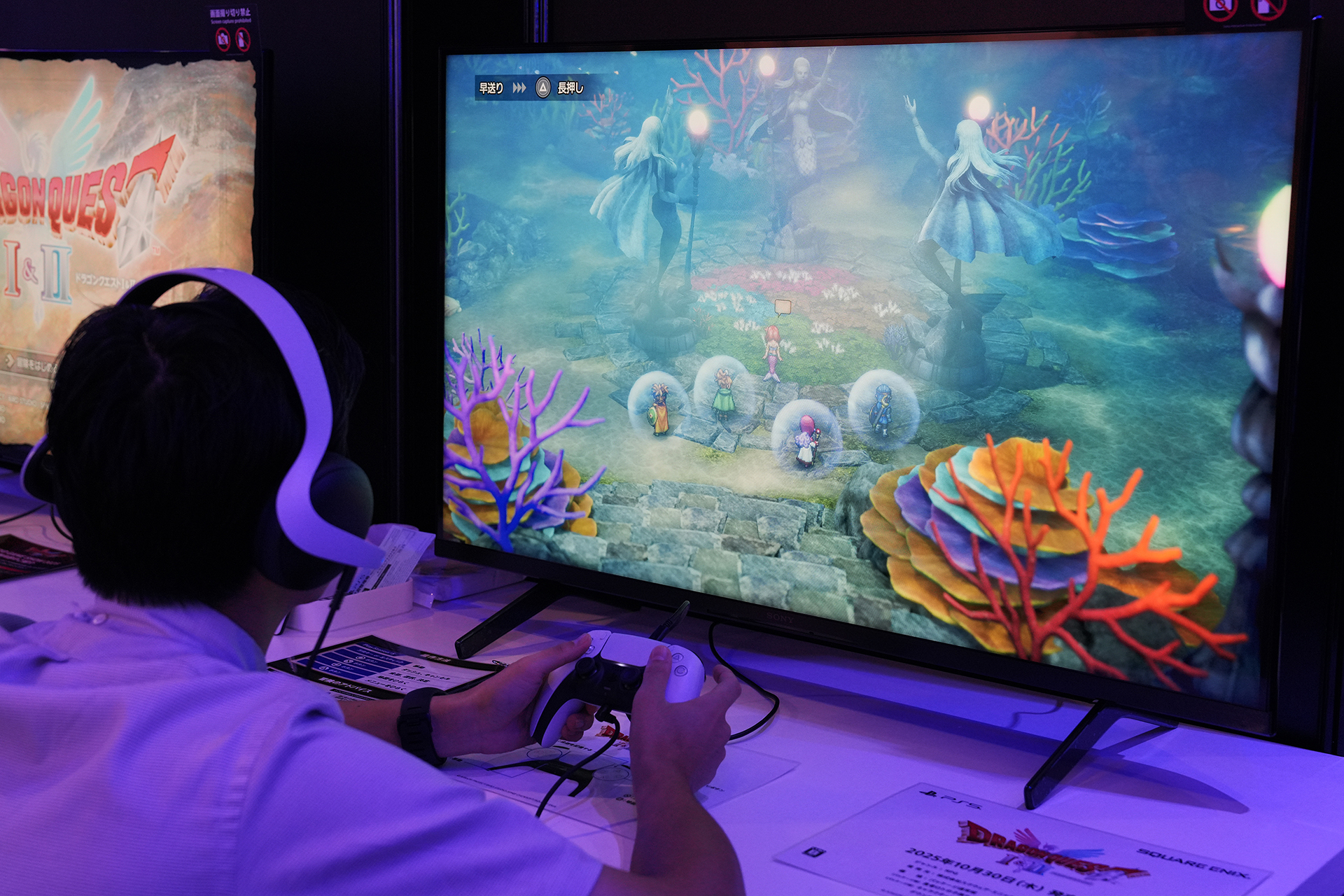 プレイステーションブースでは、『ドラゴンクエストI』と『ドラゴンクエストII』のどちらか片方を15分間試遊できる。『ドラゴンクエストI』でプレイできるのは、「とうぞくのかぎ」をめぐる新シナリオ。『ドラゴンクエストIII そして伝説へ…』でおなじみの盗賊カンダタを名乗る人物が登場し、バトルを繰り広げることになる。『ドラゴンクエストI』とは時代設定が異なるため、あのカンダタと同一人物とは思えないが、その正体は……? 気になる人はこちらをプレイしよう。『ドラゴンクエストII』では、海底の世界へ旅立ち、人魚たちの危機を救うことに。人魚たちが暮らす世界は、原作から新たに追加された冒険の舞台。HD-2Dグラフィックで描かれる海の世界で船旅を楽しめるうえ、パーティメンバーにはサマルトリアの王女の姿も。新しくなった『ドラゴンクエストII』を感じられるので、迷ったらこちらを選ぶのがおすすめだ。もちろん、目的地以外の町やフィールド、ダンジョンを自由に探索することもできる。