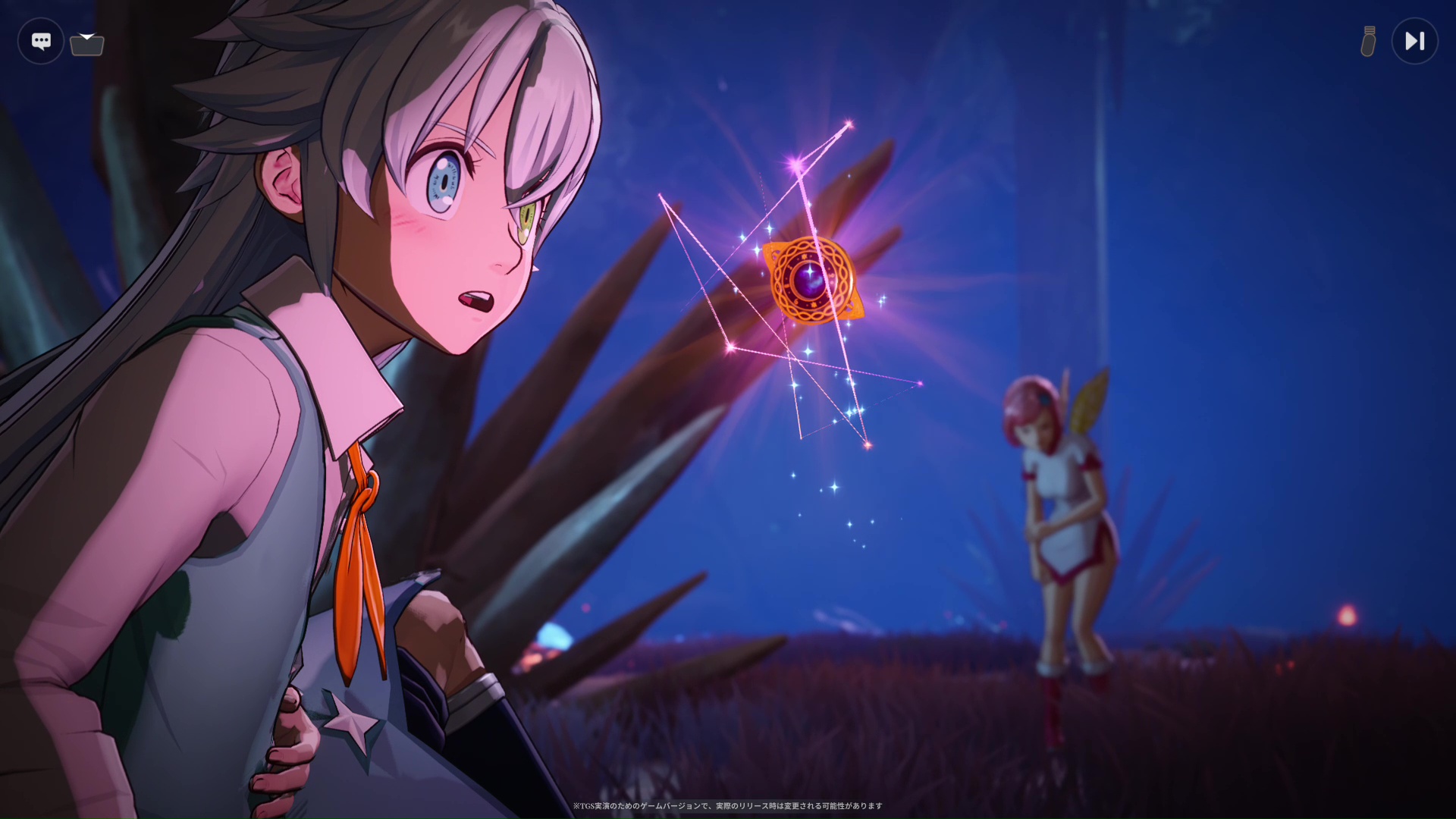 プレイステーションブースでは、ストーリーモードとオープンワールドモードを30分にわたって試遊できる。どちらを遊ぶ場合も、まずはチュートリアルからスタート。プレイ中、L1ボタンとR1ボタンを同時押しすると、オープンワールドモードに切り替えられる。また、オープンワールドモードで同様の操作を行なうと、ボスチャレンジに移行することも可能だ。ただし、どちらの場合も一度切り替えると元のモードには戻れないので要注意。世界観や物語を味わいながらゲームの基本を知るにはストーリーモード、広大な世界を駆け巡り、強敵とのバトルに挑むならオープンワールドモードがおすすめだ。どちらを選んでも、本作の魅力のひとつであるバトルアクションは十分楽しめる。戦闘はシンボルエンカウント式で、敵と接触するとバトルスタート。□ボタンで通常攻撃、△ボタンで特殊攻撃、○ボタンで通常スキルを発動でき、特殊攻撃と通常スキルは一定時間が経過することで再び使用できるようになる。敵に通常攻撃を命中させる、もしくはスキルを使用すると魔力を獲得でき、一定以上貯まればR2ボタンで強力な必殺技も繰り出せる。カットイン演出とともに敵に大ダメージを与えることができ、爽快感も抜群だ。