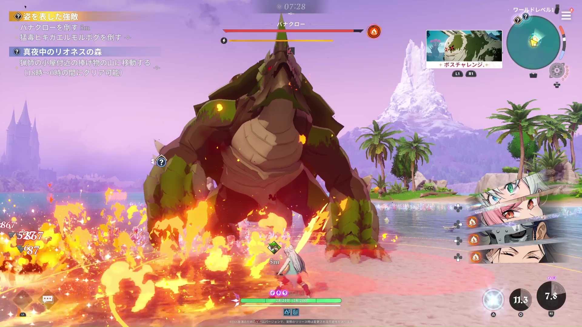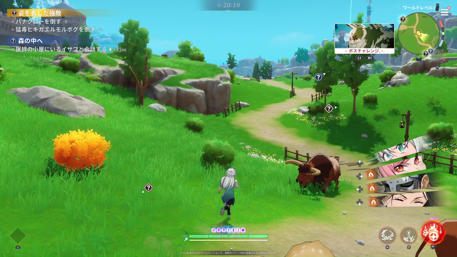 オープンワールドモードでは、プレイヤーキャラクターを次々切り替えながら敵と戦うこともできた。各方向キーに4体のキャラクターが割り当てられており、スイッチゲージが溜まればキャラを切り替えることができる。例えば「ティオレー」なら空中を飛びながら戦うなど、キャラクターによって戦闘スタイルもさまざま。もちろん特殊攻撃や必殺技などもそれぞれ異なり、L2ボタンでは各キャラ固有の特殊スキルも発動できる。「トリスタン」はきびきび軽快、「スレイダー」は大振りで重ための動作とキャラによって操作感も異なるので、自分のプレイスタイルに合ったキャラを探すのも楽しそう。異なるキャラの必殺技を連続で使用すれば、ふたりによる合技も発動できる。ボス級の強敵は、攻撃のバリエーションも多彩。例えば、亀のような姿の「バナクロー」なら、甲羅から爆発物を発射したり、腕を地面に叩きつけて衝撃波を起こしたり、尻尾を振り回したりと実に手ごわい。移動操作+R1ボタンで素早く攻撃を回避し、後ろ足のあたりから攻撃を仕掛けるも、あえなく敗退……。試遊時間内であれば拠点から再開できるが、苦戦を強いられるのは間違いないだろう。