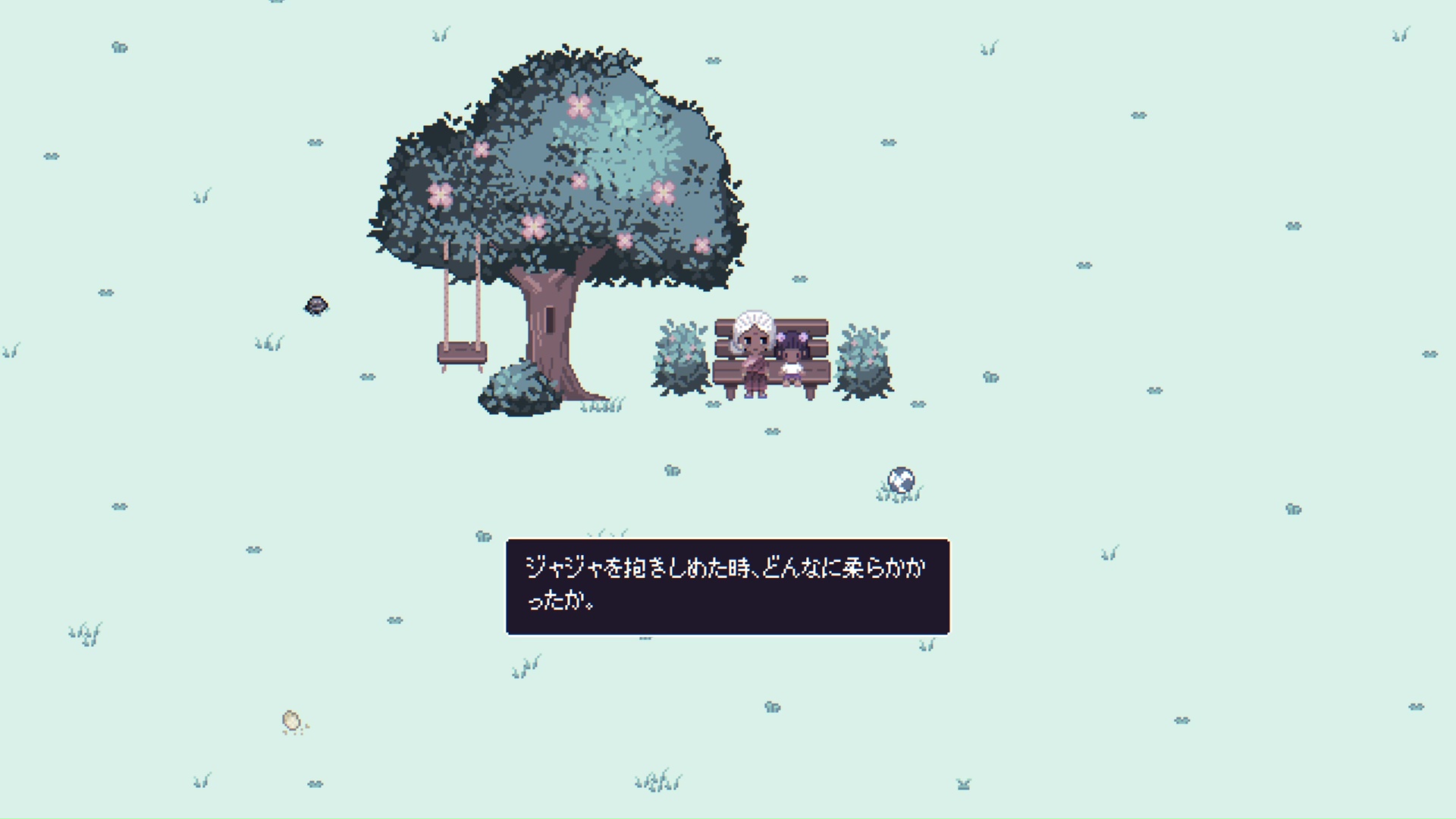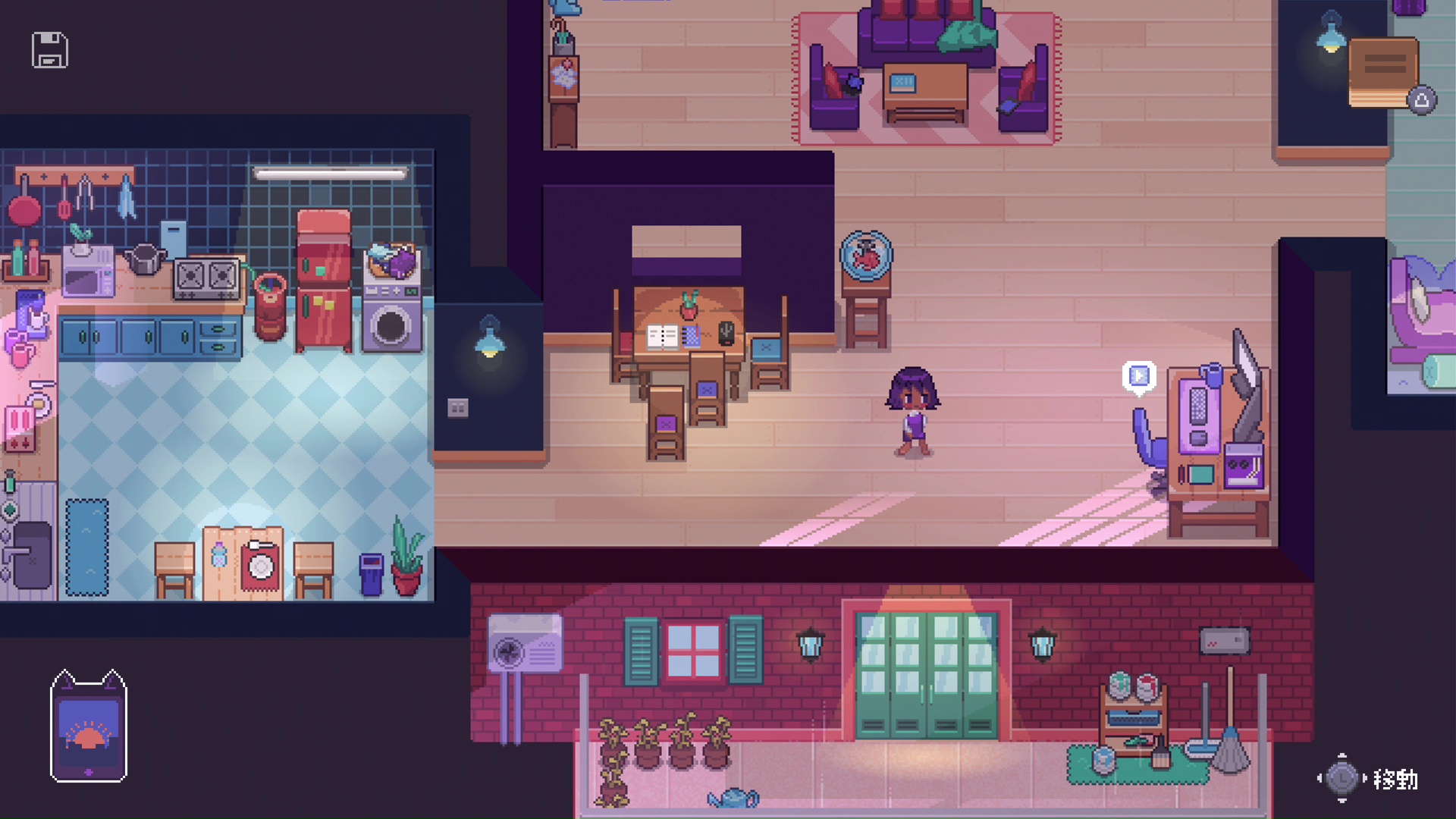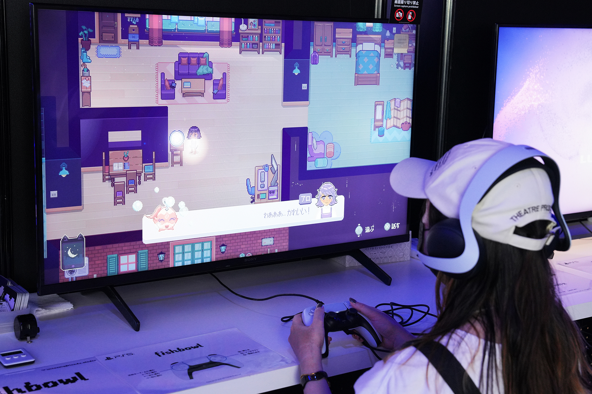 プレイステーションブースでは、ゲームの冒頭をプレイできるデモ版が用意され、20分にわたって試遊できる。PlayStation®Storeでも本作のデモ版を配信中だが、対応言語は英語のみ。プレイステーションブースでは日本語に翻訳されたバージョンをプレイすることが可能だ。思い出の品を見つけるパズルや動画編集のミニゲームなども体験でき、ゲームの世界観や基本的なゲームの流れをひと通り把握できるようになっている。まず目を引くのは、パステルカラーで描かれたピクセルアートのグラフィック。特に、アロの自宅のインテリアは細部まで凝っており、カラフルで実にかわいらしい。その一方で夢の中や心象風景はモノトーンで描かれており、色彩の対比により彼女の孤独や沈んだ気持ちを表わしているようだ。ゲームシステムはシンプルで、移動して気になるポイントにインタラクトし、会話などの選択肢を選びながらストーリーを進めていく。その過程でアロの胸中、子どもの頃の思い出などが少しずつ明かされ、彼女の人生に触れることができる。
