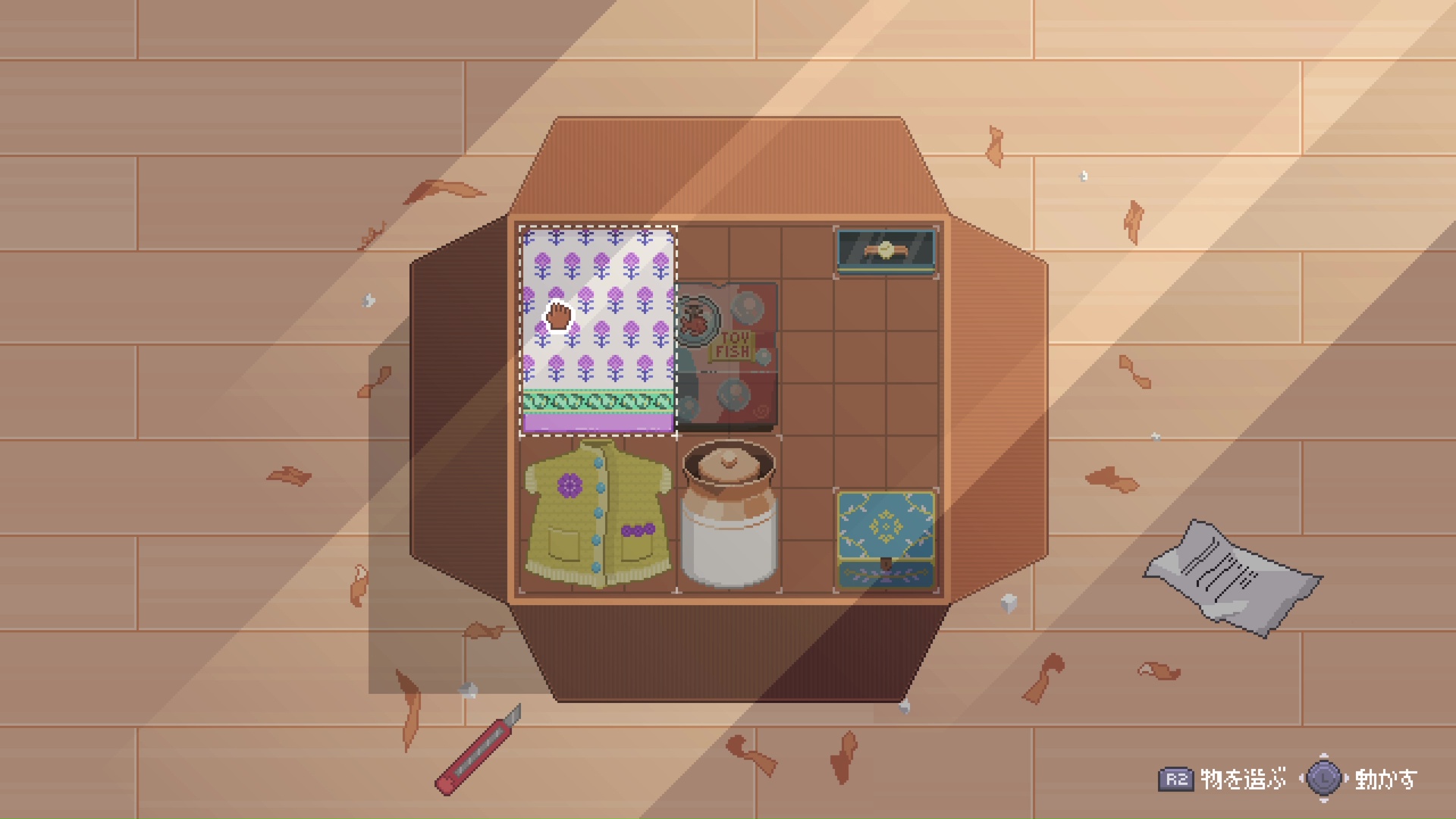 ゲームをスタートすると、雨の中、仕事を終えてリキシャで帰宅するアロの姿が描かれる。新しい仕事に就き、ひとり暮らしを始めて1週間、「今はただ、家にいたい…」とつぶやき、沈んだ様子がうかがえる。それもそのはず、アロは1ヵ月前に祖母ジャジャを亡くしたようだ。帰り道、母親とビデオ通話をして家につくと、玄関には母が送ってきた祖母の遺品が。ここで、スライドパズルがスタート。ダンボールに入った荷物をスライドさせ、その下にあるアイテムを取り出せばOKだ。クリア後には、各アイテムにどんな思い出が詰まっているのか、アロのコメントを読むことができ、祖母との深い絆を感じさせる。最後に取り出した遺品は、丸い鉢に入った金魚のおもちゃ。タイトルにもなっているこの金魚鉢が、物語のカギを握るようだ。デモ版の終盤には金魚のおもちゃが喋りだし、アロを過去の思い出へといざなっていく。幼い頃、大好きな祖母に優しくハグされたこと、肩口から我が家のにおいがしたことなど、心の柔らかいところをそっと撫でるような優しい物語に浸ることができる。