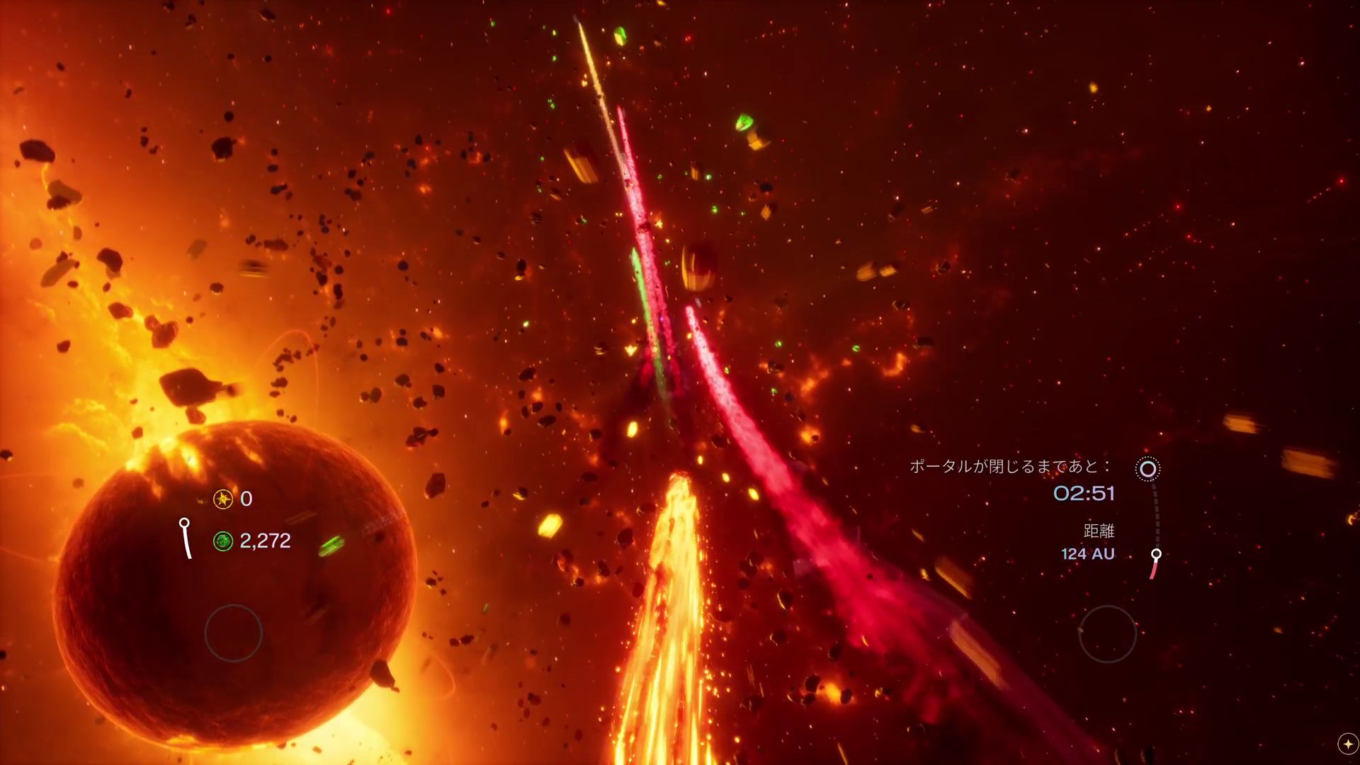プレイヤーは宇宙空間を疾走する隕石となり、小惑星群を避け、ライバルの隕石を破壊しながら、ゴールであるポータルゲートに飛び込むことを目指すことに。まずは試遊できる4つのステージについて紹介していこう。チュートリアルステージでは、操作方法と基本ルールをレクチャーしてくれる。操作方法はいたってシンプル。L2/R2ボタンで左右に回転しながら進む方向を調整し、左スティックを左右に倒したときは急速回避となる。360度、好きな方向へ飛べるわけではなく、パイプ状の見えないコースの中を進んでいると思えばイメージしやすいだろうか。コース上に配置されたアイテムにラインを合わせて獲得し、当たるとダメージを受ける小惑星群はラインを外して回避することになる。「質量」は、HPのようなステータス。グリーンのジェムを取ると増えていき、小惑星群などに衝突すると減っていく。金色のスターを取ると、×ボタンでブースト加速できる。ゴールするまでの時間制限があるため、加速して急ぐ区間も必要だ。そのほか、獲得したパワーアップアイテムはL3/R3ボタンで使用する。チュートリアルは、これらを実際に操作しながら覚えられるので、試遊する際はまずこちらをプレイすることを強くおすすめしたい。
