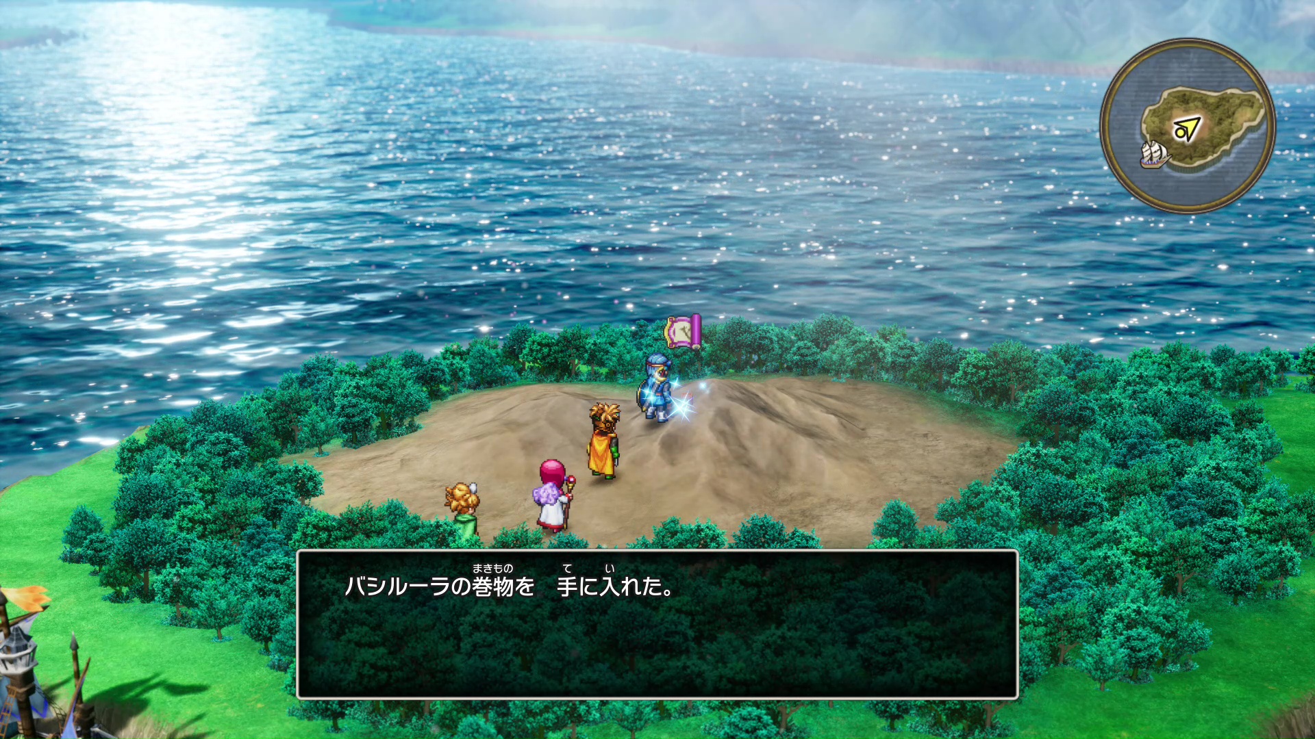 『ドラゴンクエストII』の試遊は、ベラヌールの町からスタート。悪の大神官ハーゴンの手下が海底の世界で人魚の住処を襲撃しようとしているとの噂を耳にし、一行は海底を目指すことになる。まずは「ルーラ」を使い、人魚の岩場へ向かうといいだろう。勇者ひとりだった『ドラゴンクエストI』とは異なり、『ドラゴンクエストII』では4人パーティで冒険を進めていく。メンバーはローレシアの王子、サマルトリアの王子、ムーンブルクの王女、そして今回新たに加わったサマルトリアの王女。彼女は動きが素早く、「ヒャダイン」「メラミ」などの呪文、「しんくうは」「らせん打ち」などの特技を駆使して戦ってくれる。ただし、こちらがコマンドを選択しても、ランダムで違う行動を取ることも。やんちゃで感情豊かなタイプなので、バトルだけでなくストーリーも盛り上げてくれるだろう。フィールドの探索中、宝箱から「巻物」が見つかることがあるが、『ドラゴンクエストII』では巻物ごとに使用できるメンバーが決まっているようだ。使用すれば特技や呪文をすぐに習得できるため、これらを集める楽しさも味わえそうだ。