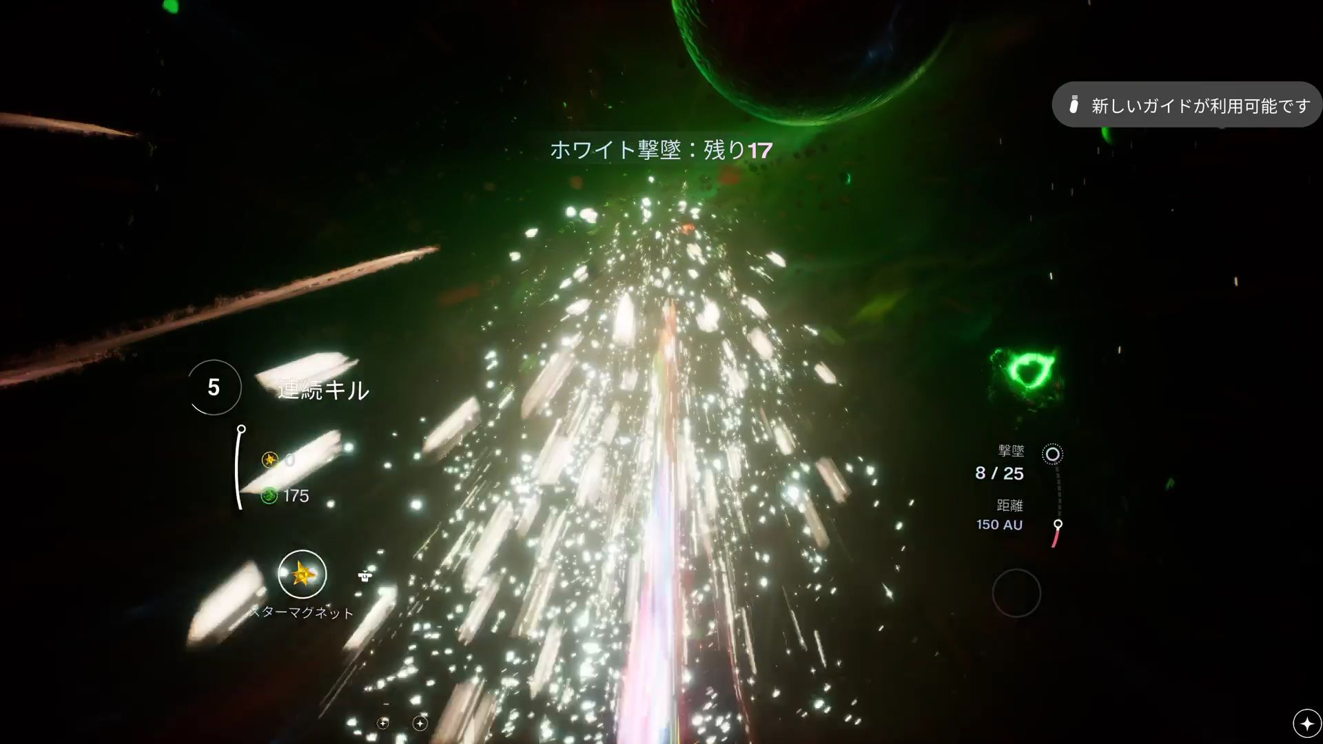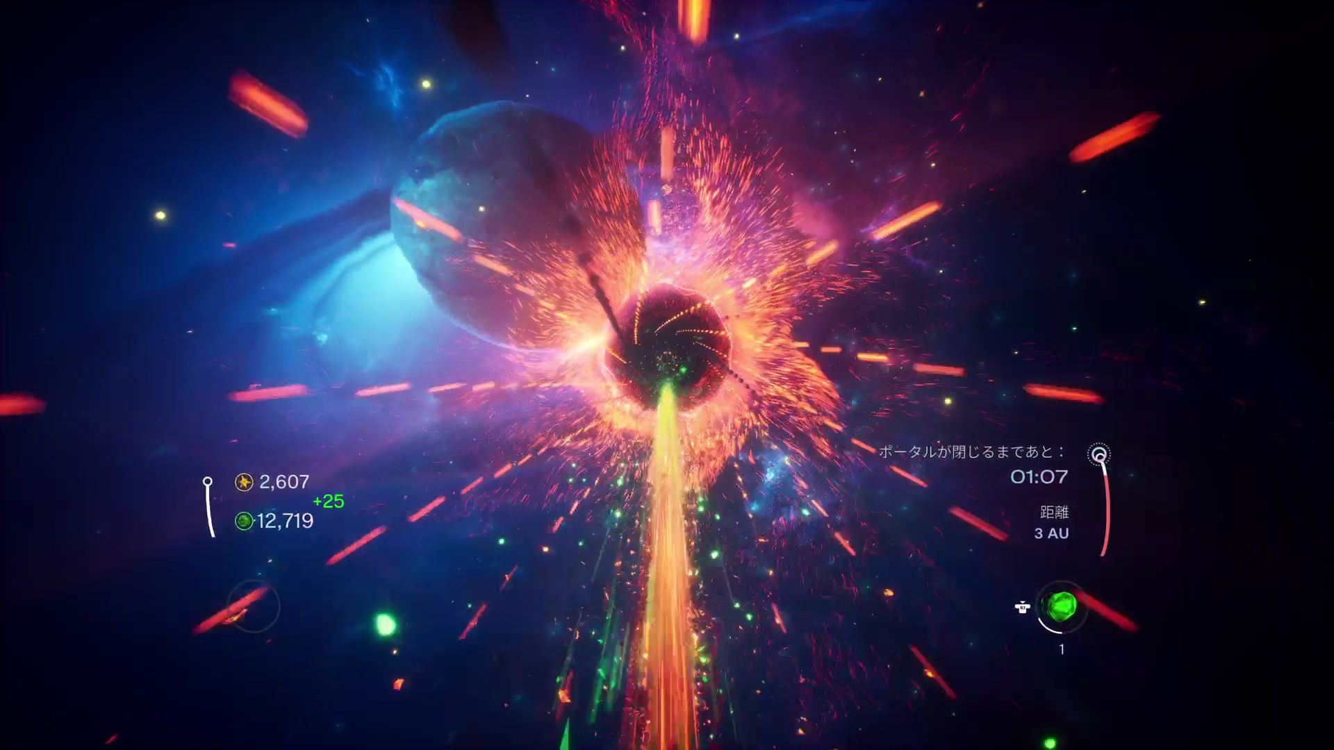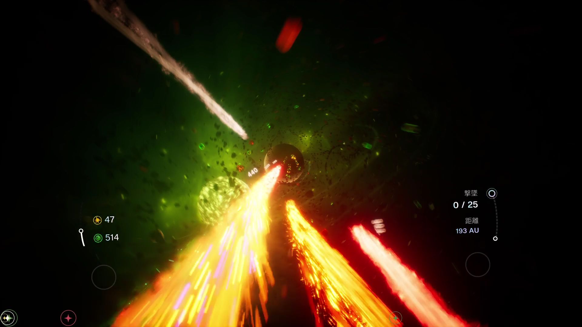 ステージ2の「撃墜」には、ライバルの隕石が登場する。体当たりすると撃墜することができ、ポータル到達までに規定の撃墜数に達せばクリアとなる。基本的に、ライバルは自分を後ろから追い越す形で登場するので、ラインを合わせながら加速し、後ろから体当たりするのが撃墜の基本形だ。いつでも加速できるようにスターを集めておく必要があるのはもちろん、ステージ1よりも小惑星群が多く出現するため、ジェムも集めて質量を大きくしておかなければならない。また、体当たりを外して追い越してしまったときのために、L2ボタンとR2ボタンの同時押しによる減速も使ったほうがいい。ステージ1より考えることが多く、操作も複雑になっているが、撃墜できるとかなり気持ちいい。コンボのように連続キルが決まると、さらに爽快だ。最後のステージ3は「タイムアタック」。ポータル到達までのタイムを競うのはステージ1と同じだが、今回はライバルの隕石が登場する。さらに、アイテムはカクカクと動いているため回収しづらく、小惑星群には爆発タイプも数多く含まれるなど、コース設計がかなり難しくなっている。アイテムは取り逃し、障害物は避けられないという散々なプレイが続き、結局このステージをクリアすることはできなかった。