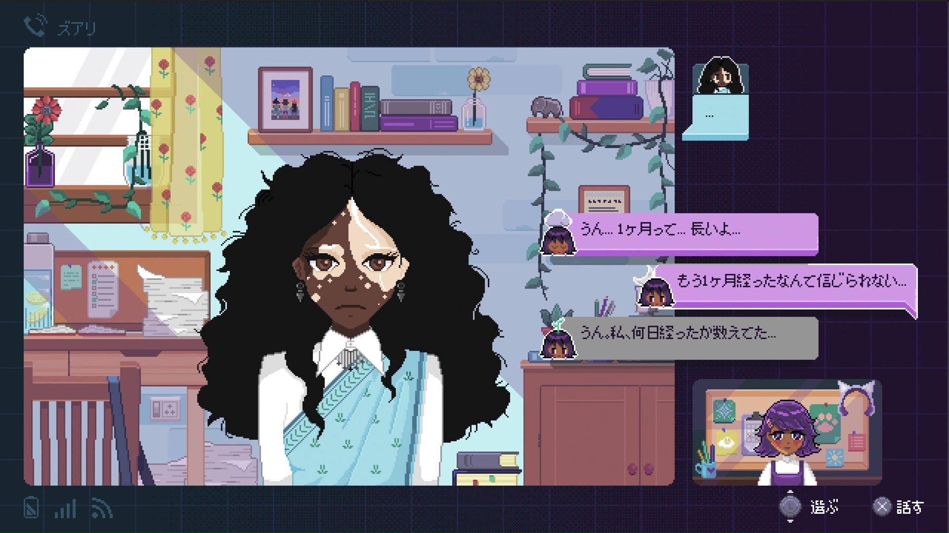 自宅では、もうひとつやるべきことがある。それは動画の編集。アロは有名インフルエンサーの動画編集者をしており、自宅でも仕事をしているようだ。この編集作業も、ミニゲーム形式になっている。操作はシンプルで、画面右側から流れてくる動画クリップを上下に動かし、同じ色のトラックとマッチさせるだけ。ちょっとしたリズムアクションゲームのようだが、まだゲーム序盤のせいか、そこまで高度な反射神経は求められない。徐々に流れるスピードが速くなっていくが、前のクリップが片付く前に次のクリップを動かさないよう、焦らずプレイすれば問題なくクリアできる。仕事の前後では、会社の先輩メグノーゾとの会話も。その後も、友人のズアリからの着信でビデオ通話を楽しむなど、このゲームではさまざまな人たちとのコミュニケーションも見どころになっている。アロが憧れの職場で働き始めたこと、そのために引っ越したこと、アロの会社もズアリが働く学校もリモートになることなどが徐々に明かされていく。詳細がわかるにつれて、アロへの親近感も増すだろう。