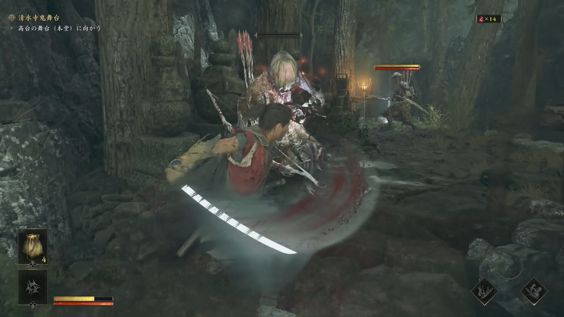 敵の攻撃は、ボタンひとつで簡単に防御できる。側面や背後からの攻撃にも対処でき、背後からの攻撃を振り向くことなく刀で背中越しに防ぐモーションがまさに達人といった趣でカッコいいため、つい何度も狙ってしまった。敵の攻撃を華麗に防御しているだけでも気持ちいいのだが、本作には受け流しと弾きという、さらなる防御手段も用意されている。受け流しは敵の攻撃をタイミングよく防御すると発動し、攻撃を受け流された敵はよろめいて追撃のチャンスが生まれる。よろめいた敵が他の敵や壁などにぶつかると力動ゲージを大きく削ることができた。受け流しが成立するタイミングには余裕があり、かなり決めやすい印象だ。弾きは防御中にボタンを追加入力することで発動。成功すると敵の攻撃を直接弾いて、やはり力動ゲージを大きく削ることができる。タイミングはシビアだが、防御ボタンを押しながら他のボタンを押すという操作のため、弾きに失敗しても敵の攻撃自体は防御できるのがうれしい。敵の攻撃に合わせて攻撃ボタンを押すという、シリーズの代表的な反撃アクション「一閃」はさらにタイミングが難しいものの、決めたときの爽快感は格別だ。