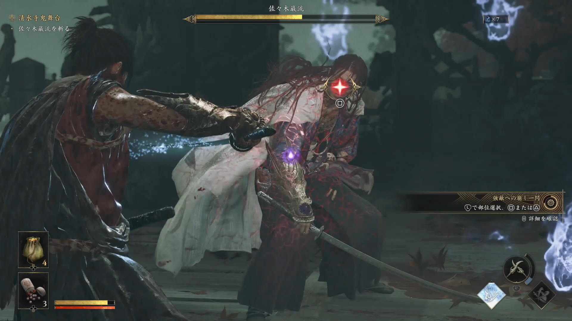 試遊のラストを飾るのは、清水寺本堂の鬼舞台で待ち受ける佐々木巌流とのボス戦だ。巌流は”佐々木小次郎”の名でも知られる武芸者であり、腕には鬼の篭手を着けている。上空からの踵落としや踊るように回転してからの剣戟など、巌流の攻撃は苛烈かつ変則的だが、なんとか受け流しながら追撃を決めて力動ゲージを削っていく。受け流しを何度も成功させていると武蔵が「気焔状態」となって刀の威力が上昇するので、ダメージも与えやすい。加えて、巌流のような強敵を相手にした際の崩し一閃は、当てる部位を選択できる特殊なものになっていた。赤い印の部位は大きなダメージを与えることができ、紫の印の部位は多くの魂を放出。大ダメージを与えて攻め込むか、魂を吸収して体力を回復するかを判断する戦略性も味わえる。巌流との戦いは、これまでの戦いで学んだテクニックを総動員して挑む、まさに死闘となっていた。すでに公開されている大鵺(おおぬえ)や大唾拉(だいだら)といった強敵と戦える日が待ち遠しい。