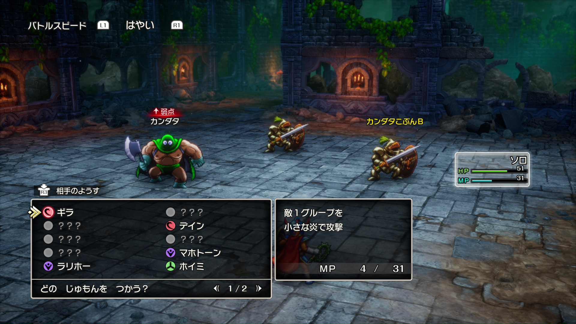 『ドラゴンクエストI』の試遊は、ガライの町で幕を開ける。町を歩いていると、伝説の勇者ロトが使用していたとされる「とうぞくのかぎ」を持っているという怪しげな商人に遭遇。彼のあとを追って南の宿屋へ向かうが、商人は何者かに襲われ、「とうぞくのかぎ」は盗まれてしまったという。そこで主人公は、かぎを盗んだ犯人を追い、岩山の洞窟を目指すことに。フィールドでは、モンスターとのランダムエンカウントバトルが発生。原作ではモンスターと1対1で戦ったが、本作では複数のモンスターを相手にひとりで戦うことになる。装備している「とげのムチ」やギラなどの呪文を使えば敵1グループをまとめて攻撃できるが、それでも1対多数の戦いはスリリングだ。中でも、岩山の洞窟で戦うことになるカンダタたちとのバトルでは苦戦を強いられる。カンダタの一撃でHPが1/4近く削られるうえ、ふたりの子分たちの攻撃もなかなか強力。ただ、本作では敵の弱点を突く特技や呪文が、ひと目でわかるようになっているのがうれしいところ。けして無理はせず「やくそう」や「ホイミ」でこまめにHPを回復し、「まほうのせいすい」でMPを補いながら敵の弱点を狙えば、きっと勝利できるはず。バトル後は、カンダタの正体も明らかに!