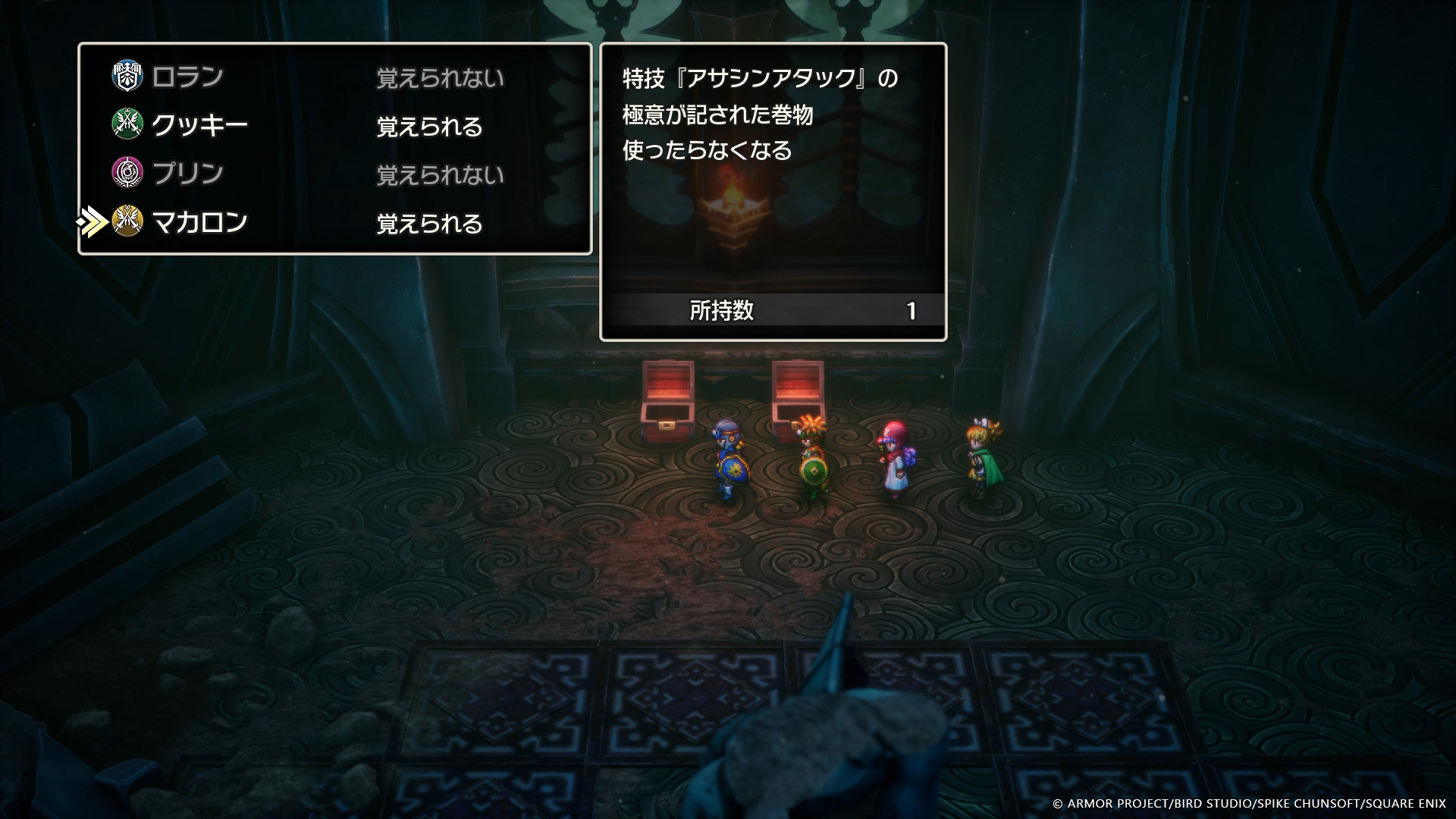 宝箱などから手に入る新アイテム「巻物」を使用すれば、パーティメンバーのうちのひとりが特定の呪文や特技を追加で覚えることもできる。