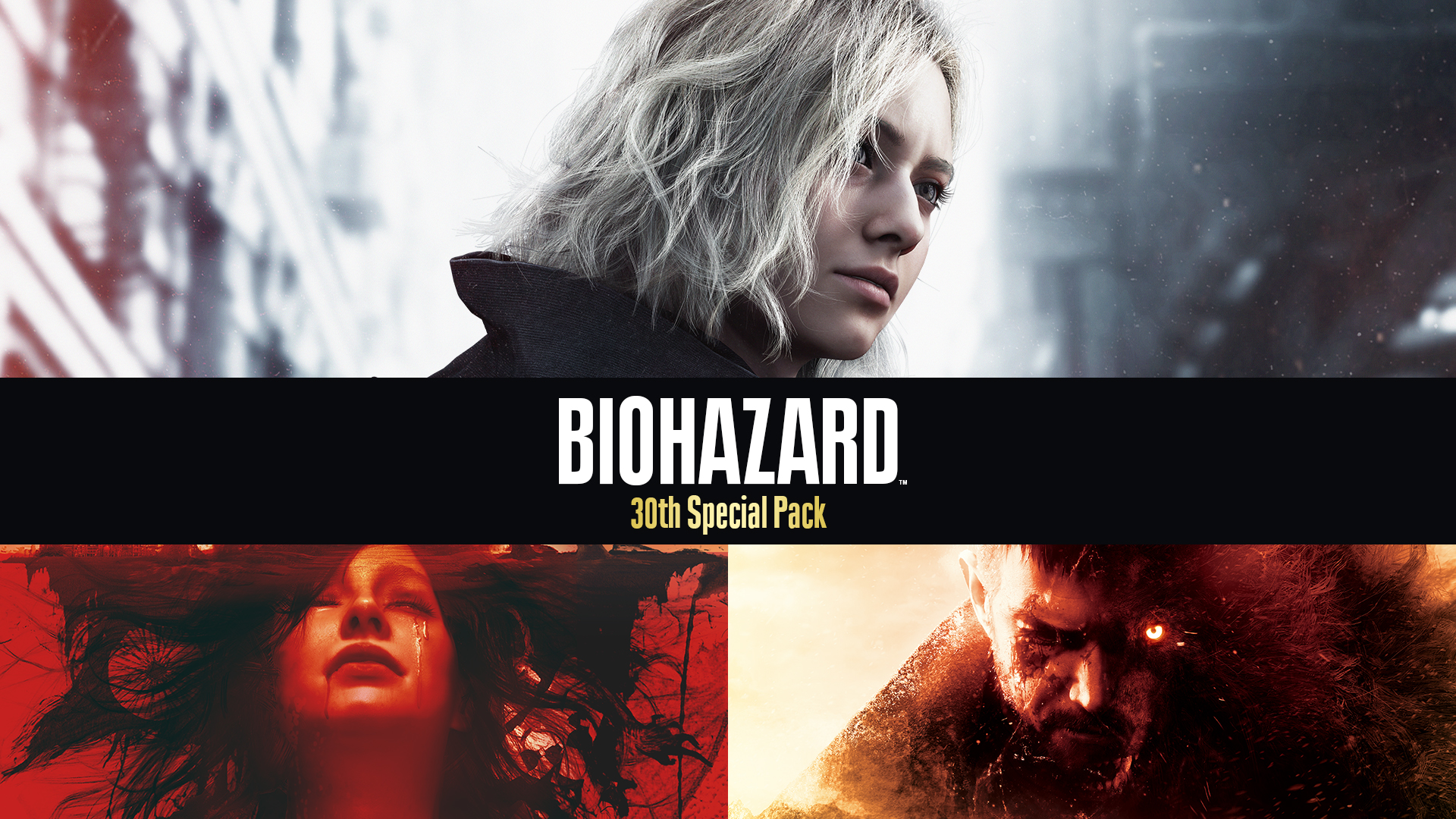 『バイオハザード レクイエム デラックスエディション』と、シリーズ最恐の呼び声も高い『バイオハザード7』、愛娘を救うために死地へ挑む父親の姿が胸を打つ『バイオハザード ヴィレッジ』の3タイトルをセットにしたオトクなパッケージ。30周年を祝した特別な装丁でお届けします。