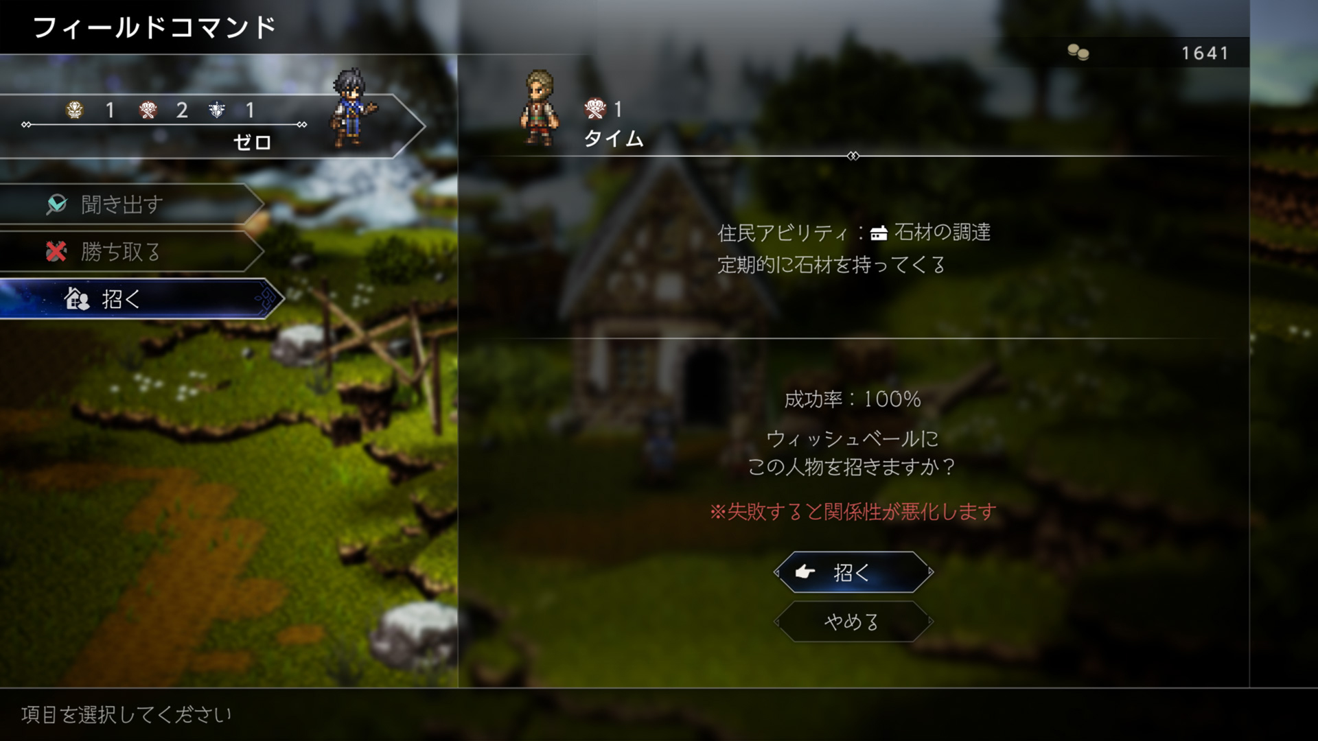 「フィールドコマンド」は、NPCに対して実行できる特殊アクションだ。町の人々とバトルをしたり、アイテムを入手したり、話す相手によってさまざまなコマンドを確認できる。本作では「招く」が追加され、移住を希望する人物をウィッシュベールの住民として招くことができる。