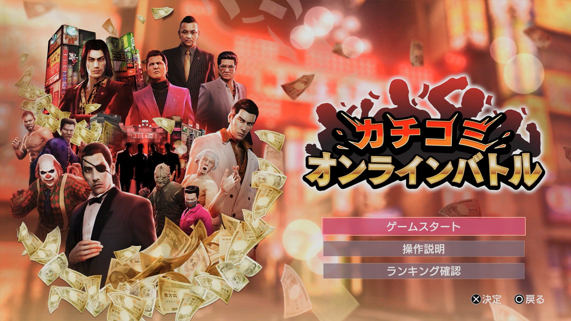 「カチコミオンラインバトル」で操作できるキャラはなんと60人。主人公である桐生や真島はもちろん、彼らの前に立ちはだかった久瀬大作、阿波野大樹、渋澤啓司、西谷誉などの強敵たちも操作できる。闘技場でライバルとして登場したキャラや、サブストーリーで活躍したキャラまで参戦し、本編をプレイした人にはたまらないラインナップとなっている。特定の条件をクリアすると、バトルで稼いだお金で新たなキャラをアンロックすることが可能だ。