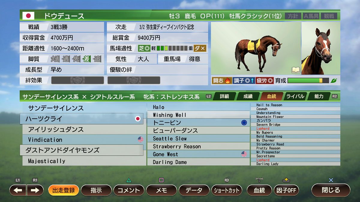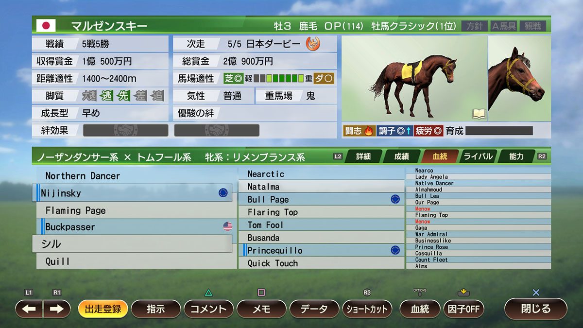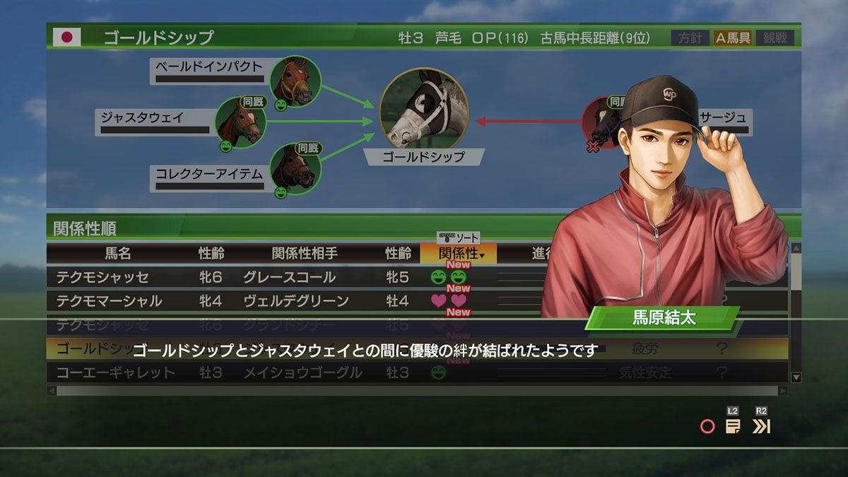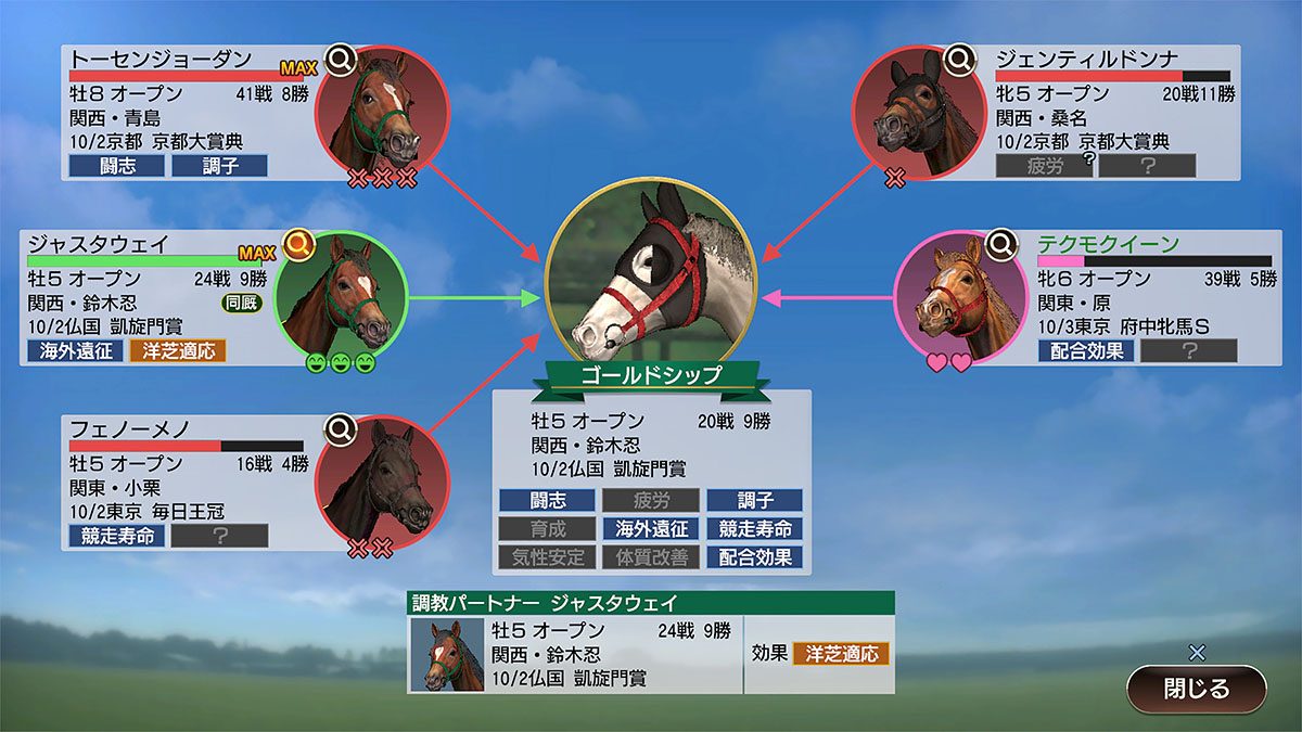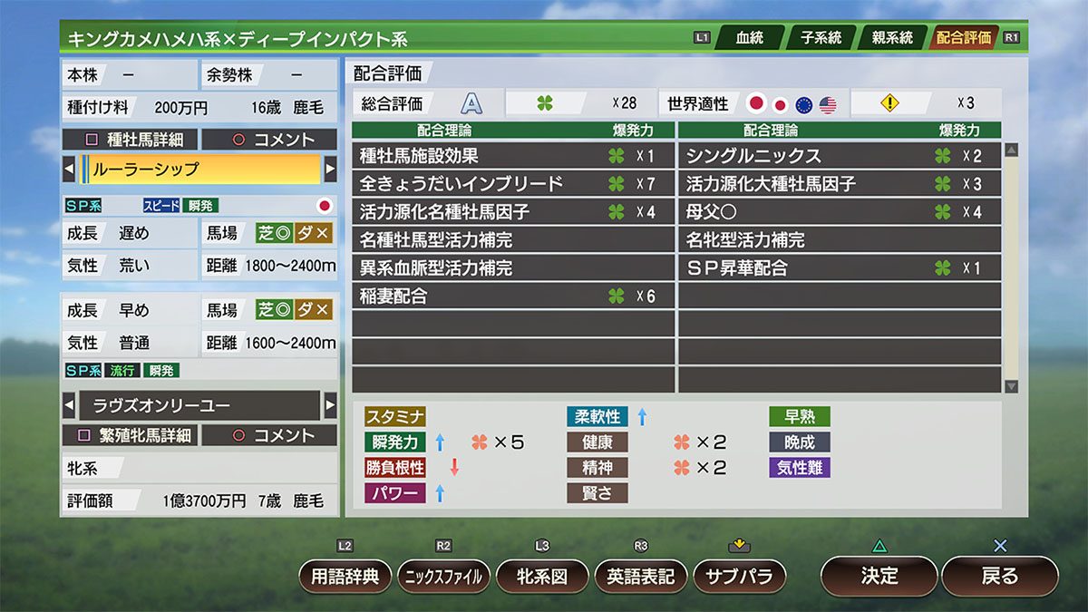 本作では新配合理論「サブパラ爆発力」の追加でニックスの重要性が増しているため、ニックス状況をしっかりと把握することも名馬生産の鍵となる。